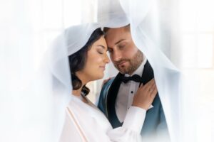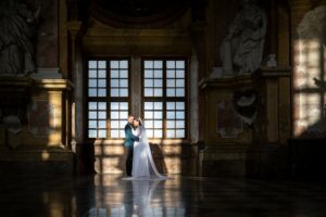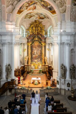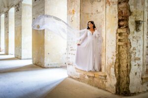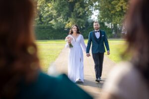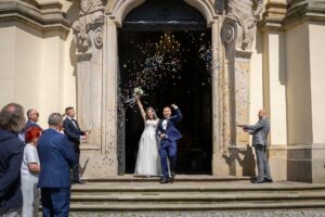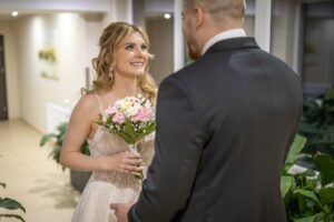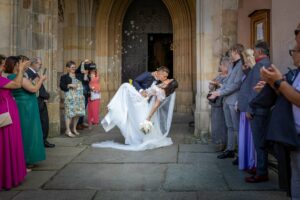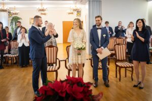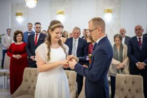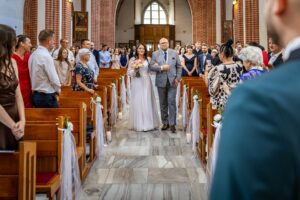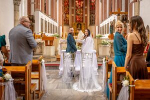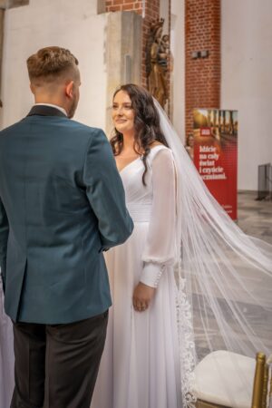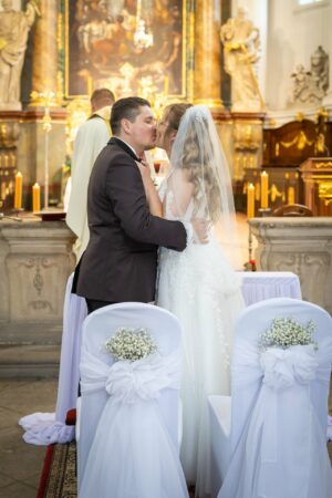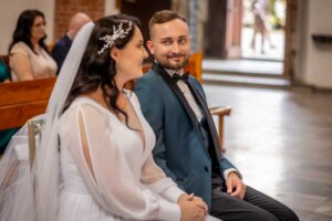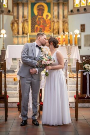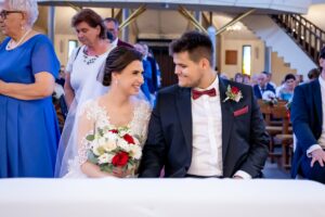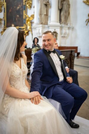 W trakcie uroczystości pracuję w sposób dyskretny i z pełnym poszanowaniem jej charakteru — zarówno w kościele, jak i w urzędzie stanu cywilnego. Skupiam się na kluczowych momentach, takich jak przysięga, wymiana obrączek czy pierwszy pocałunek, a także na emocjach Pary Młodej i bliskich.