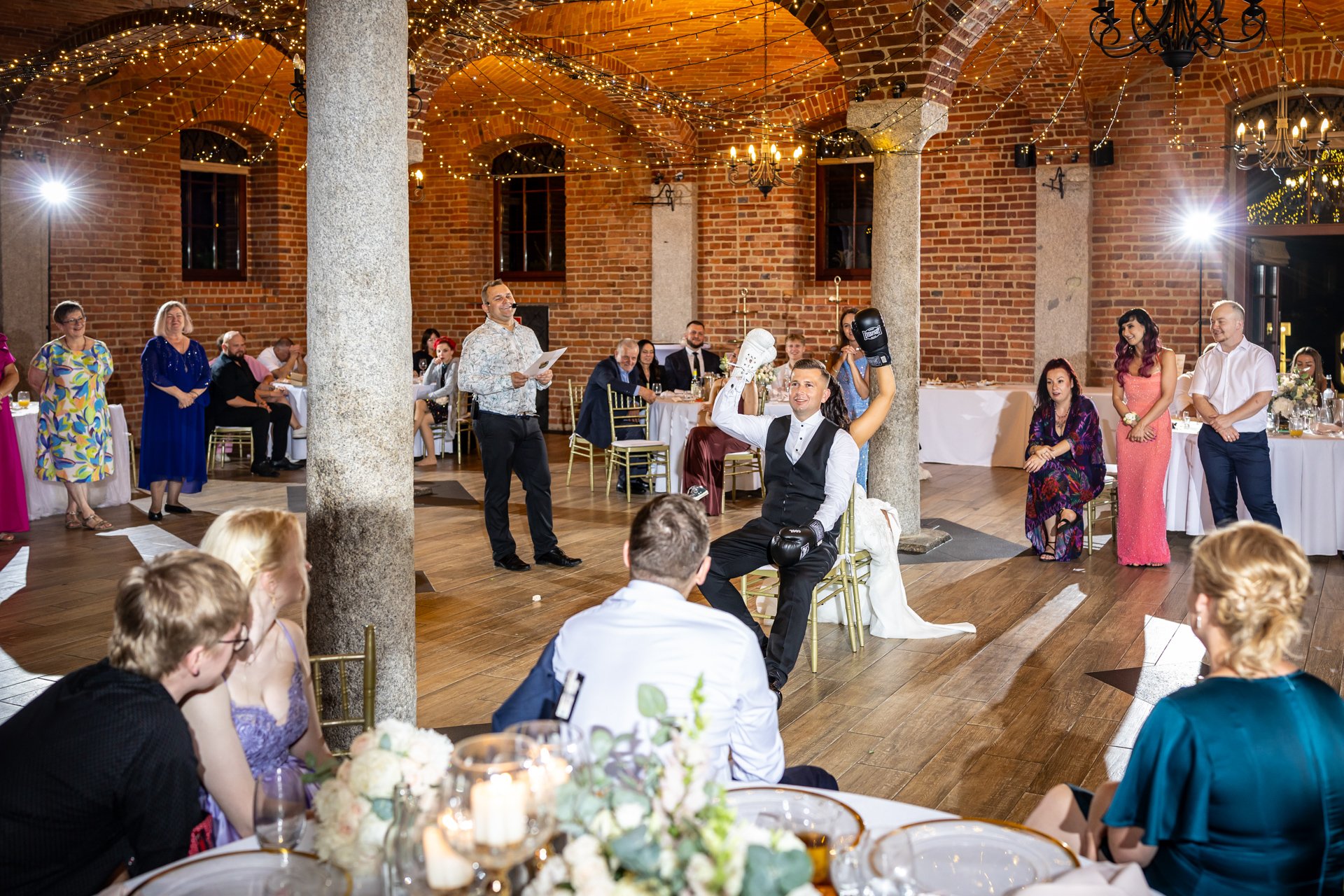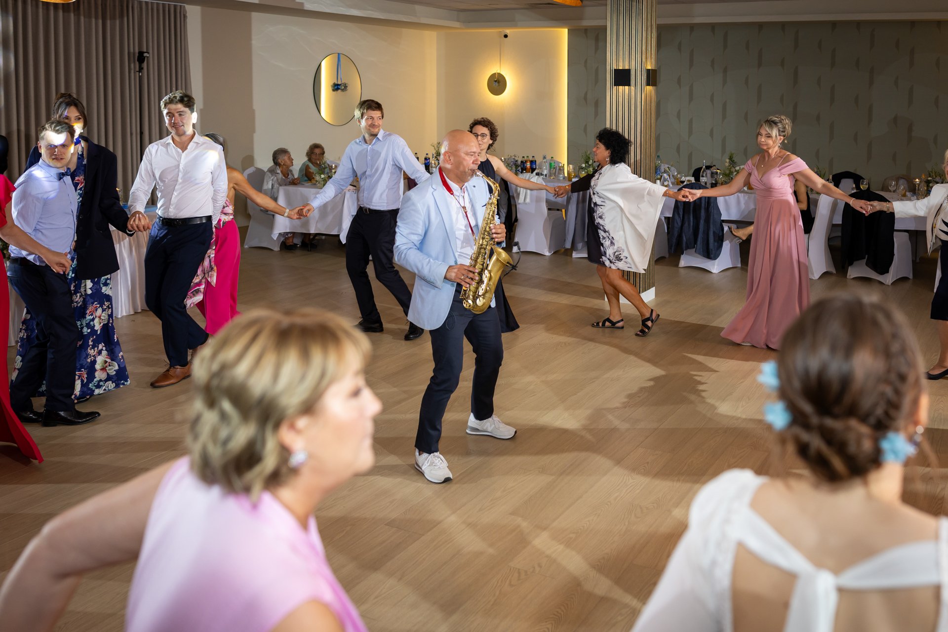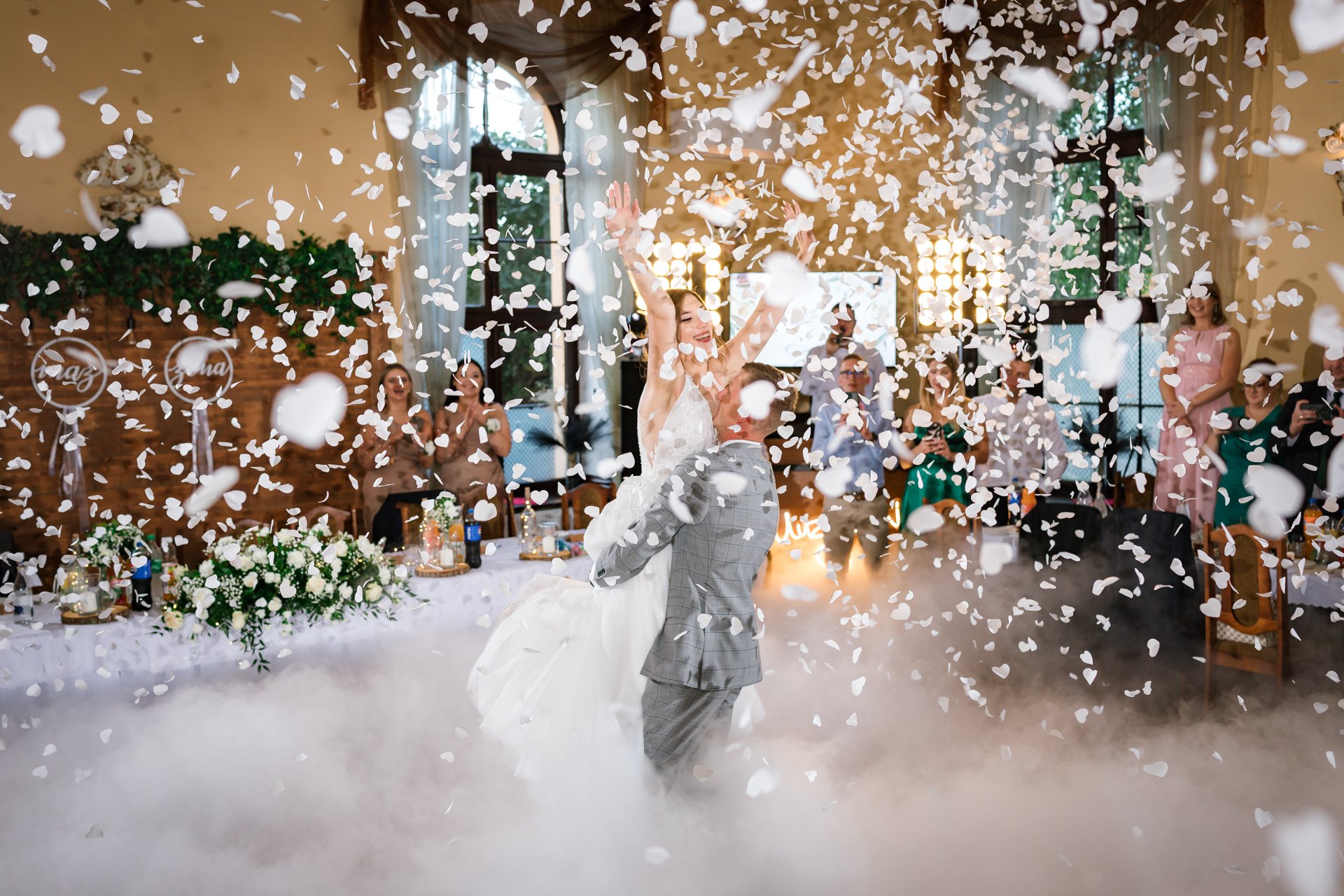 W trakcie przyjęcia rejestruję spontaniczne chwile na parkiecie, radość gości oraz wszystkie ważne punkty programu. Szczególną uwagę poświęcam takim momentom jak na przykład  podziękowania dla rodziców, krojenie tortu weselnego oraz kreatywne zabawy, które nadają weselu wyjątkowy charakter. Pracuję dyskretnie, ale zawsze blisko wydarzeń, dzięki czemu zdjęcia są naturalne, żywe i wiernie oddają atmosferę tego niezapomnianego wieczoru.