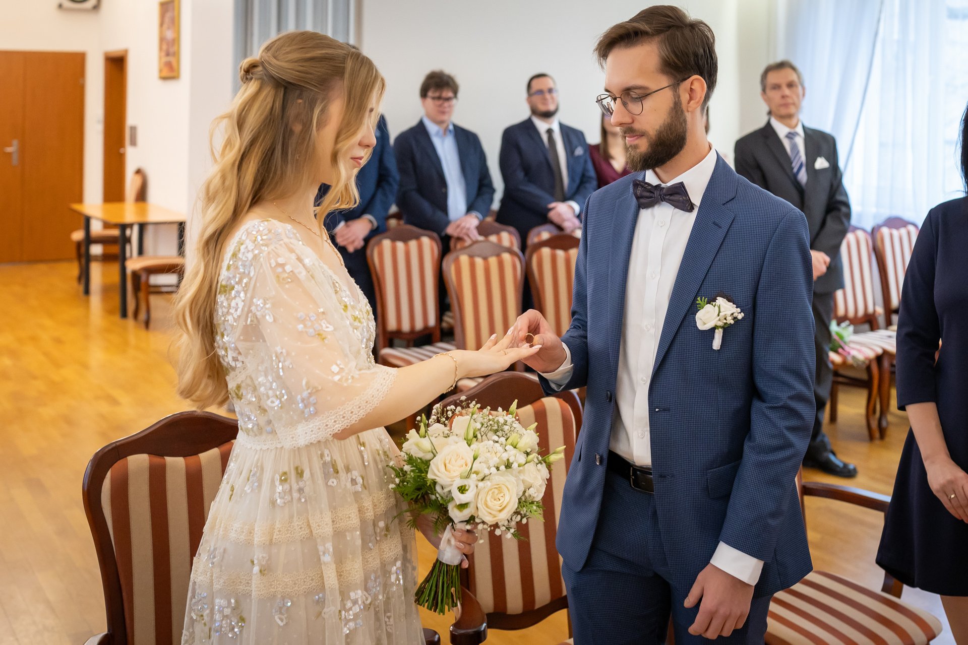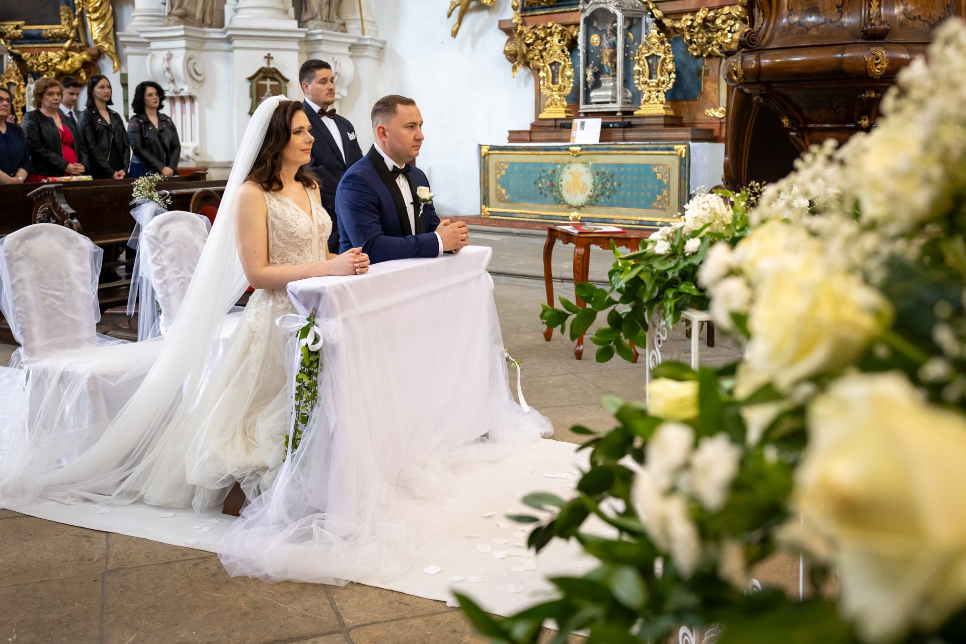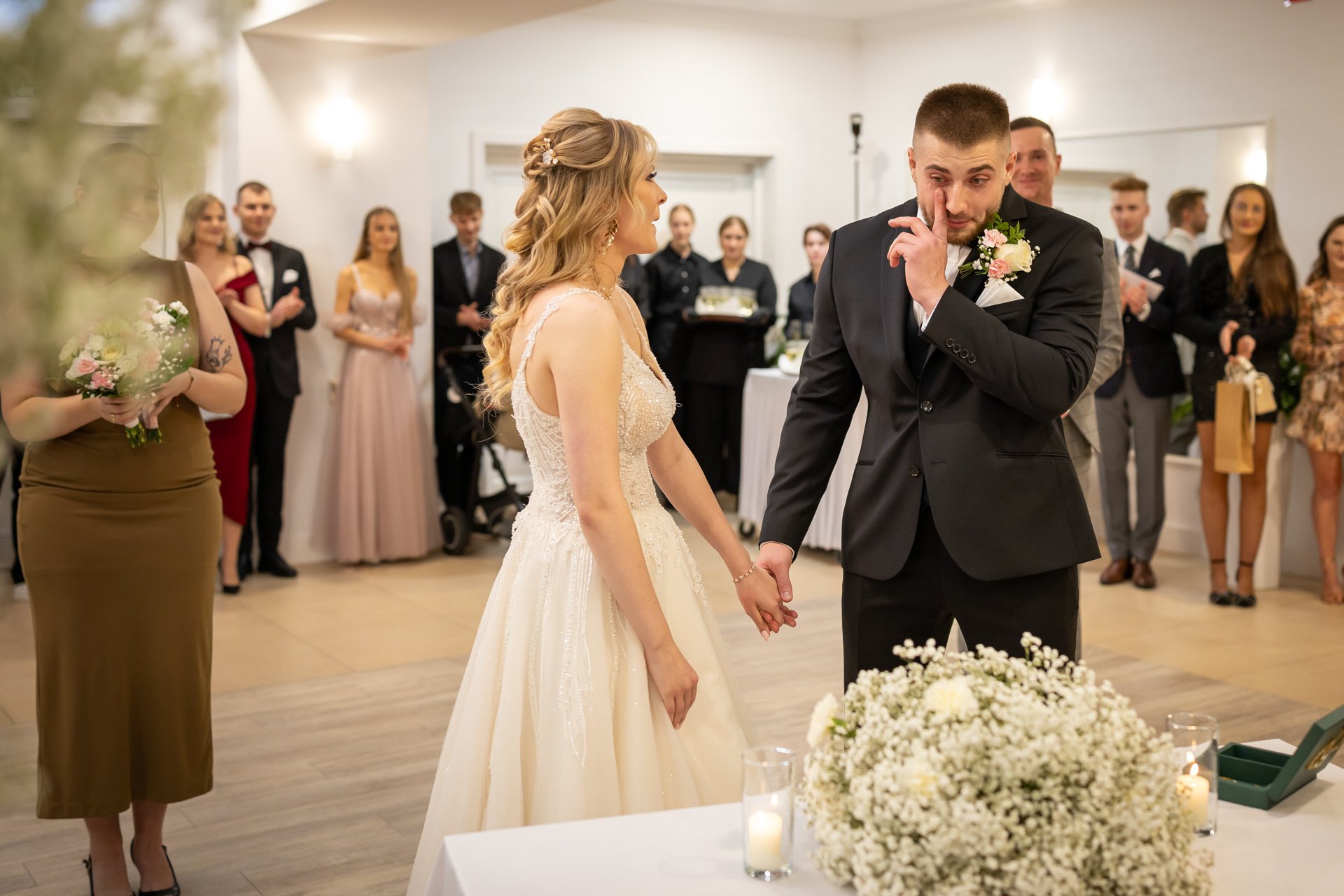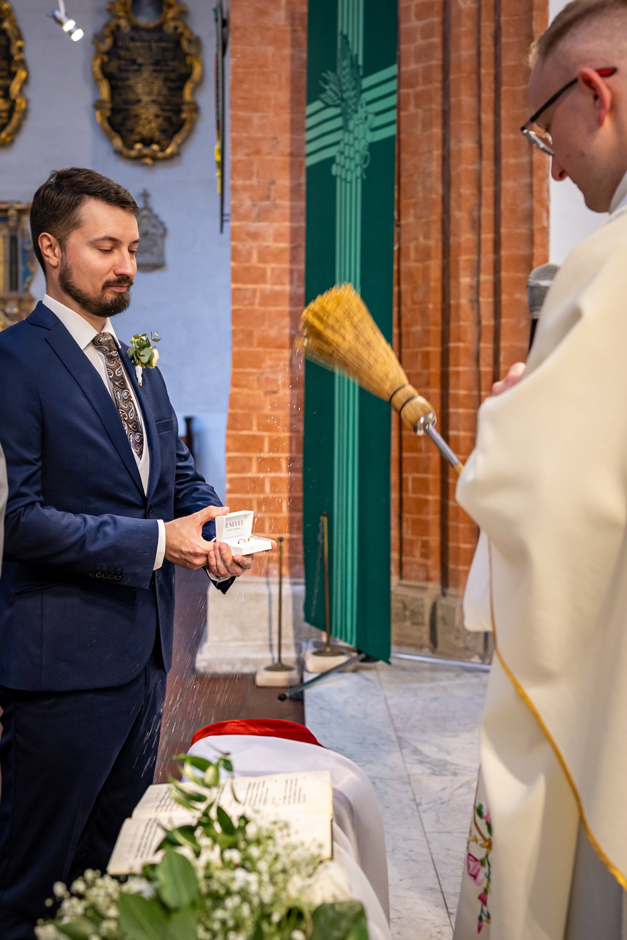 W trakcie uroczystości pracuję w sposób dyskretny i z pełnym poszanowaniem jej charakteru — zarówno w kościele, jak i w urzędzie stanu cywilnego. Skupiam się na kluczowych momentach, takich jak przysięga, wymiana obrączek czy pierwszy pocałunek, a także na emocjach Pary Młodej i bliskich.
